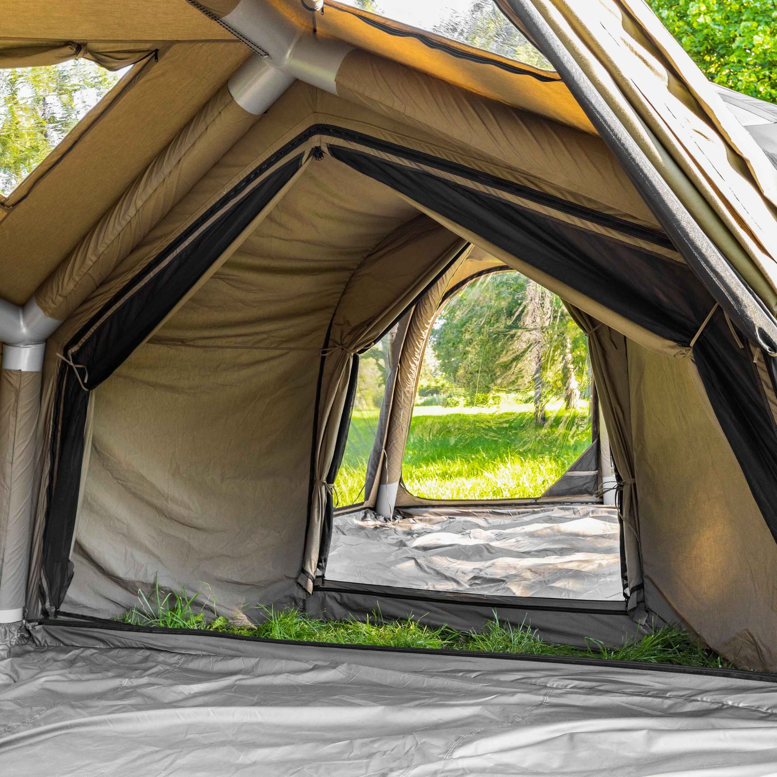 The current design includes zippers on both sides, enabling the connector to attach securely to each tent and form a stable, sealed connection that helps keep out wind and rain.